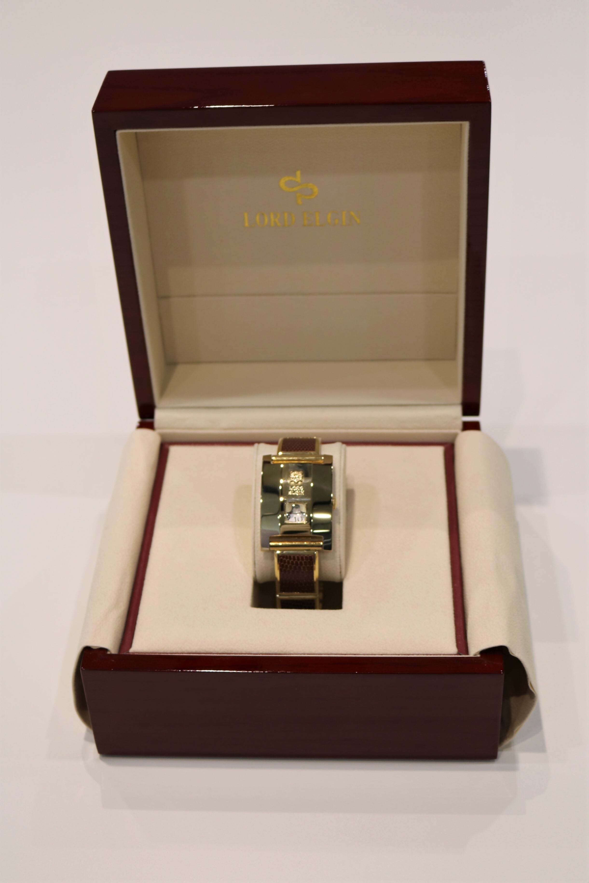 エンブレムマークはスコットランド貴族のエルギン伯爵の紋章を用いたデザイン。エルジン時計社設立にあたり、エルジン市からその名にちなんでイギリスのエルギン伯爵に「ロードエルジン」が贈呈され、当時ロードエルジンが最高のステータスとして称賛されました。